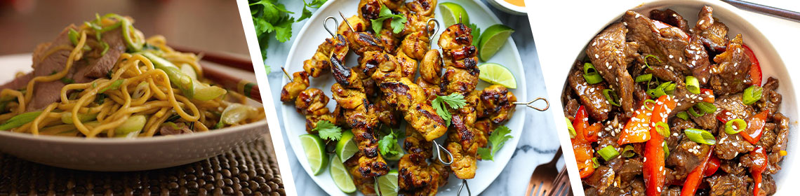 Mixed Platter ( 3 Pcs Spare Ribs, 3 Pcs Chicken Satay On Skewers, 3 Pcs Chicken Wings, 3 Pcs Mini Rolls & 3 Pcs Sesame Prawn On Toast) Satay Chicken, Beef Curry, King Prawn With Green Pepper In Black Bean Sauce & 3 Pcs Egg Fried Rice